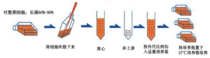 當培養的細胞增殖達到一定密度后,將會出現密度抑制現象,表現為細胞的生長和分裂速度逐漸減慢,甚至停止。貼壁細胞會在培養瓶中長成致密單層 (懸浮細胞會充滿整個體積的培養液),鋪滿培養瓶底部,此時如果不及時進行分裝再培養,即傳代培養,細胞將逐漸走向衰老、死亡,將培養的細胞從一個容器以適當比率轉移到其他容器中擴大培養,稱為傳代培養。